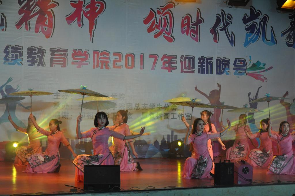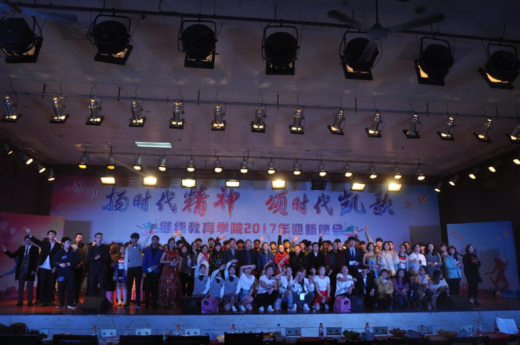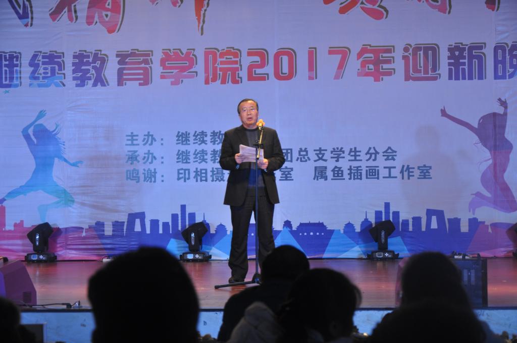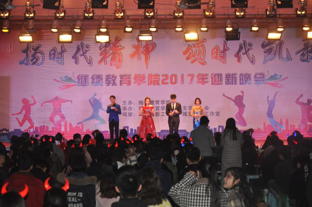 【供稿/学院学生科庄宇】为迎接2017级新生以及新年的到来, 2017年12月12日晚7点整,继续教育学院在容园三楼艺术团大厅举行了以 “扬时代精神,颂时代凯歌”为主题的迎新晚会。继续教育学院学院党总支书记杨敏、常务副院长李军良、副院长李世贵、团总支书记庄宇等以及各学院团总支书记、主席、辅导员、班主任新生参加了此次迎新晚会。