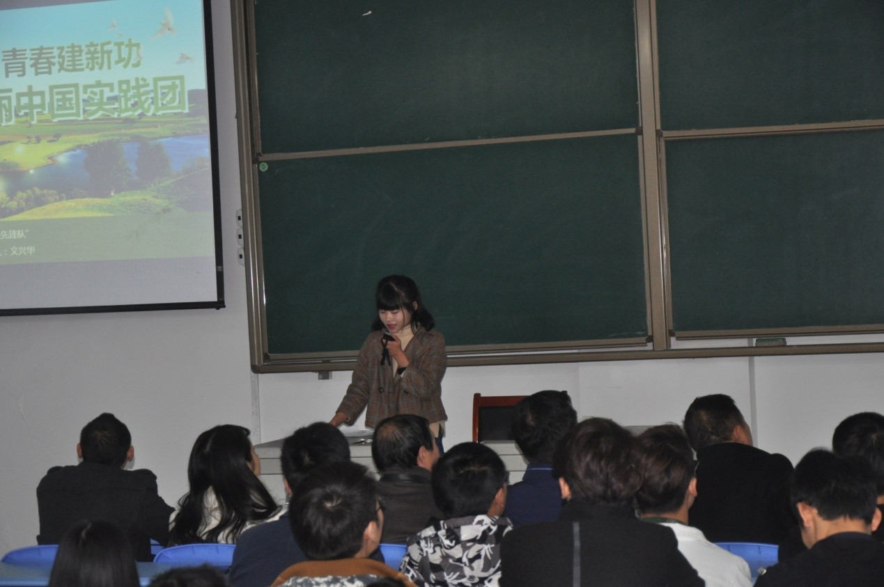 活动首先由参加此次2017年重庆市大中专学生志愿者暑期文化科技卫生“三下乡”社会实践的五位同学(文兴华、颜洋、聂建、章婷婷、钟厅)进行汇报分享,同学们从参与关爱孤寡老人,关心留守儿童,联系乡镇企业等一系列活动中,以不同的视角谈论了自己的心得体会;之后由此次实践活动队长文兴华为“三下乡”活动进行回顾总结,交流经验,总结成果,分享收获,查找不足,并将“三下乡”活动中形成的调查报告、咨询建议等理论成果转化为专业学习的辅导材料,为明年“三下乡”活动提供有益借鉴的同时总结工作中存在的不足和下一步的努力方向。