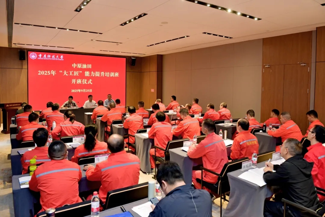 2025年9月25日上午,由中国石化集团中原石油勘探局有限公司工会委员会主办、重庆科技大学继续教育学院承办的 2025 年“大工匠”能力提升培训班顺利开班。中原油田工会副主席、群团工作部主任吕学军,中原油田工会经审委主任、群团专业高级专家韩伟利,重庆科技大学继续教育学院副处级组织员谭成,中原油田各二级单位30余名学员参加开班仪式。